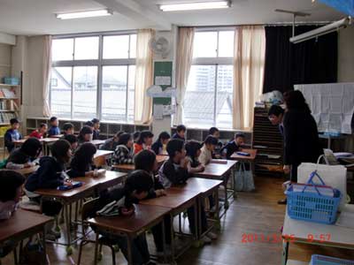 そして、私は母校の廊下を歩きながら、教室を見回っていました。一つの一年生の教室前を通る時、一番ドアに近い男の子が私を見て、突然先生に叫びました:「先生、さっき本を贈った人が来た!」それを聞いた子供達が、急に一斉に私のところへ走って来ました。私を囲んでいる、元気で親しい子供達は、本当にかわいいと思います。私は、みんなと握手をして、先生に招かれその教室に入りました。みんなに「はじめまして、どうぞよろしくお願いします」と言ったら、みんな大きな声で一斉に挨拶してくれました。少し会話をした後、授業の邪魔にならないため、子供達と「バイバーイ」を交わしました。